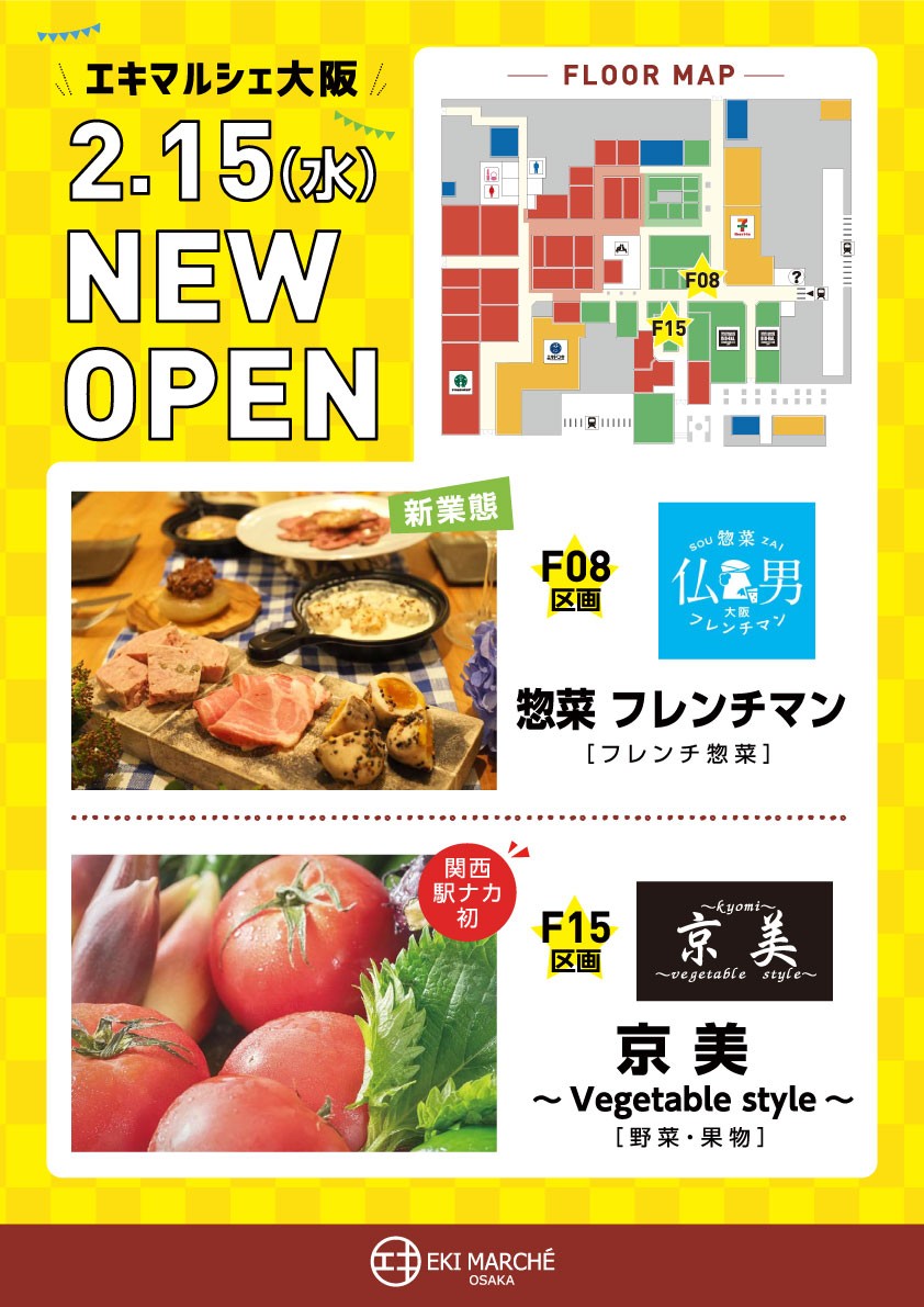 非常感谢您一直以来使用eki marche大阪。 在大阪·东京开设了4家店铺的“大众酒馆法国人”的法式家常菜,可以轻松在自己家享用的新业态外带专卖店“家常菜法式人”和以京都蔬菜为中心,汇集了全国各地蔬菜、水果的“京美~蔬菜style~”将于2月15日(星期三)开业。欢迎光临。 详情请点击这里 https://www.dailyservice.co.jp/news/