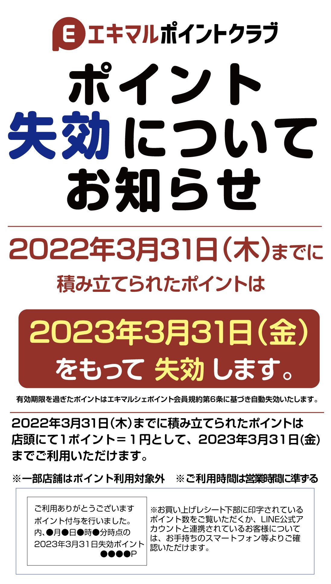 非常感谢您一直以来使用eki marche大阪。 2022年3月31日(周四)之前积累的ekimaru积分将于2023年3月31日(周五)失效。 请尽早使用。