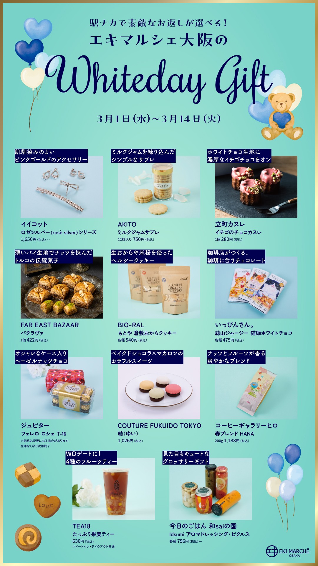 3月14日是白色情人节!在eki marche大阪,甜点自不必说,还有可爱的杂货等适合白色情人节的商品种类丰富。根据店铺的不同,营业到22点,请务必趁这个机会来看看。♬