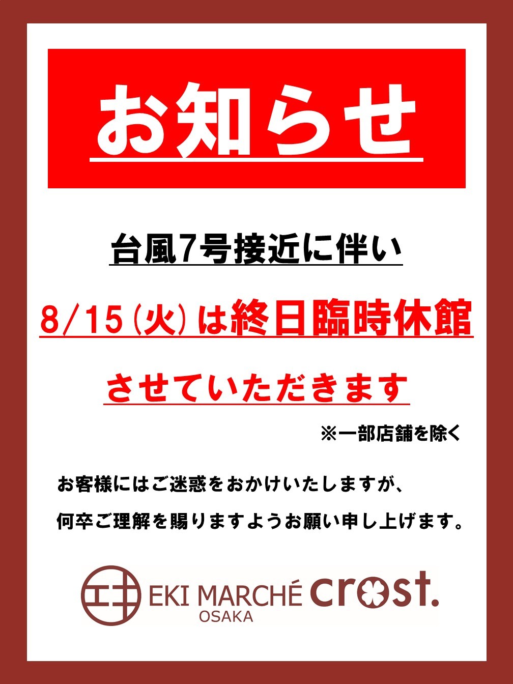 非常感谢您使用eki marche大阪十字架。 由于7号台风的接近,2023年8月15日(周二)全天临时休馆。(也有部分正常营业店铺) 另外,关于8月16日(星期三),根据铁路的运行状况等,可能会对营业产生影响,请注意。 给客人带来不便,请您理解。