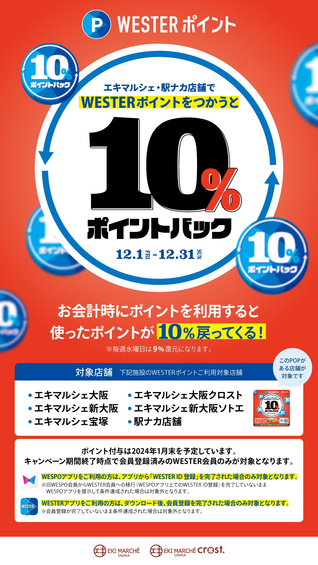 从12月1日(周五)到31日(周日)期间,利用eki marche・JR西日本站naka店铺积累的“WESTER积分”(JR西日本集团共通积分)购物的顾客,将实施能获得积分的“WESTER积分10%回扣活动”!