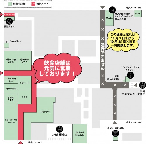 非常感谢您一直以来使用eki marche大阪。 “eki marche大阪”现在正在为10月26日的更新开业做准备。因此,随着开业准备,10月1日(周五)~25日(周一)期间,eki marche大阪口检票口及一部分通道将关闭。 施工期间会给您带来不便,请继续惠顾。