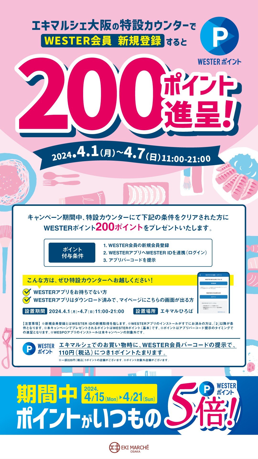4月1日(星期一)~4月7日(星期日)期间,在Event space介绍的WESTER会员新入会展台入会的话,当场会赠送200WESTER积分。 关于礼物的详细条件等,请从下面确认。