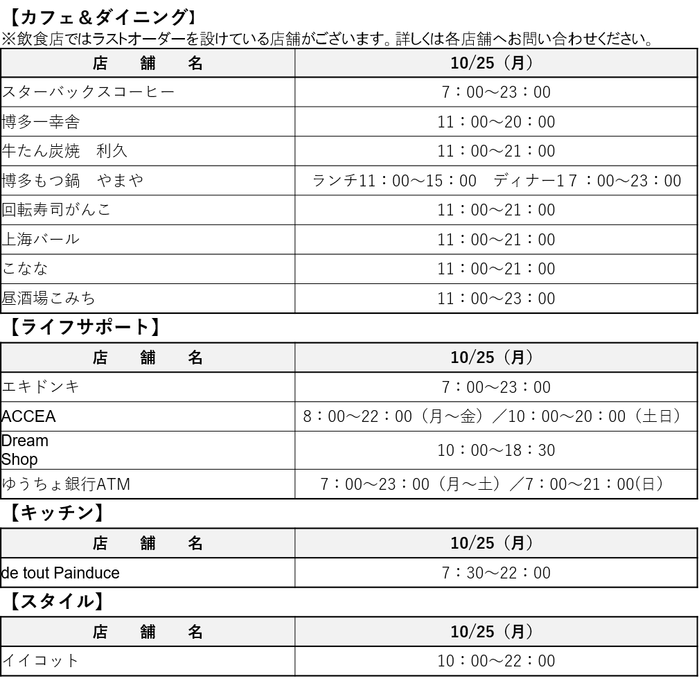 非常感谢您一直以来使用eki marche大阪。 随着大阪府请求的变更,10月25日(周一)的10月25日(周一)的营业时间将变更如下。 给客人带来不便,请您理解。 另外,关于更新开业日(10月26日)以后的营业时间将再次通知。