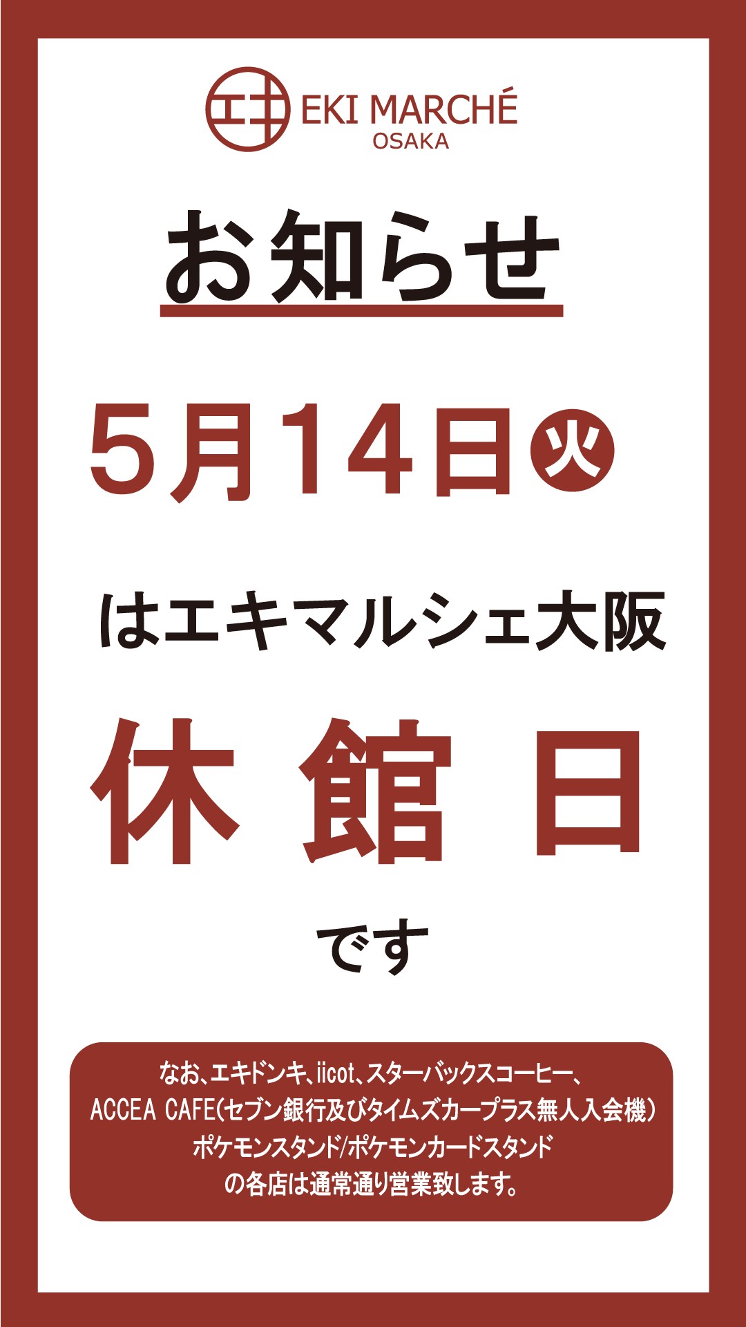 感谢您使用eki marche大阪。 2024年5月14日(周二),eki marche大阪是休馆日。 也有一部分正常营业的店铺,请一定要去看看。 ※部分营业店铺如下。 Ekidonki、ACCEA CAFÉ、ACCEA内七银行ATM及时代车共享无人入会机、iicot、星巴克咖啡、口袋妖怪支架/口袋妖怪卡支架