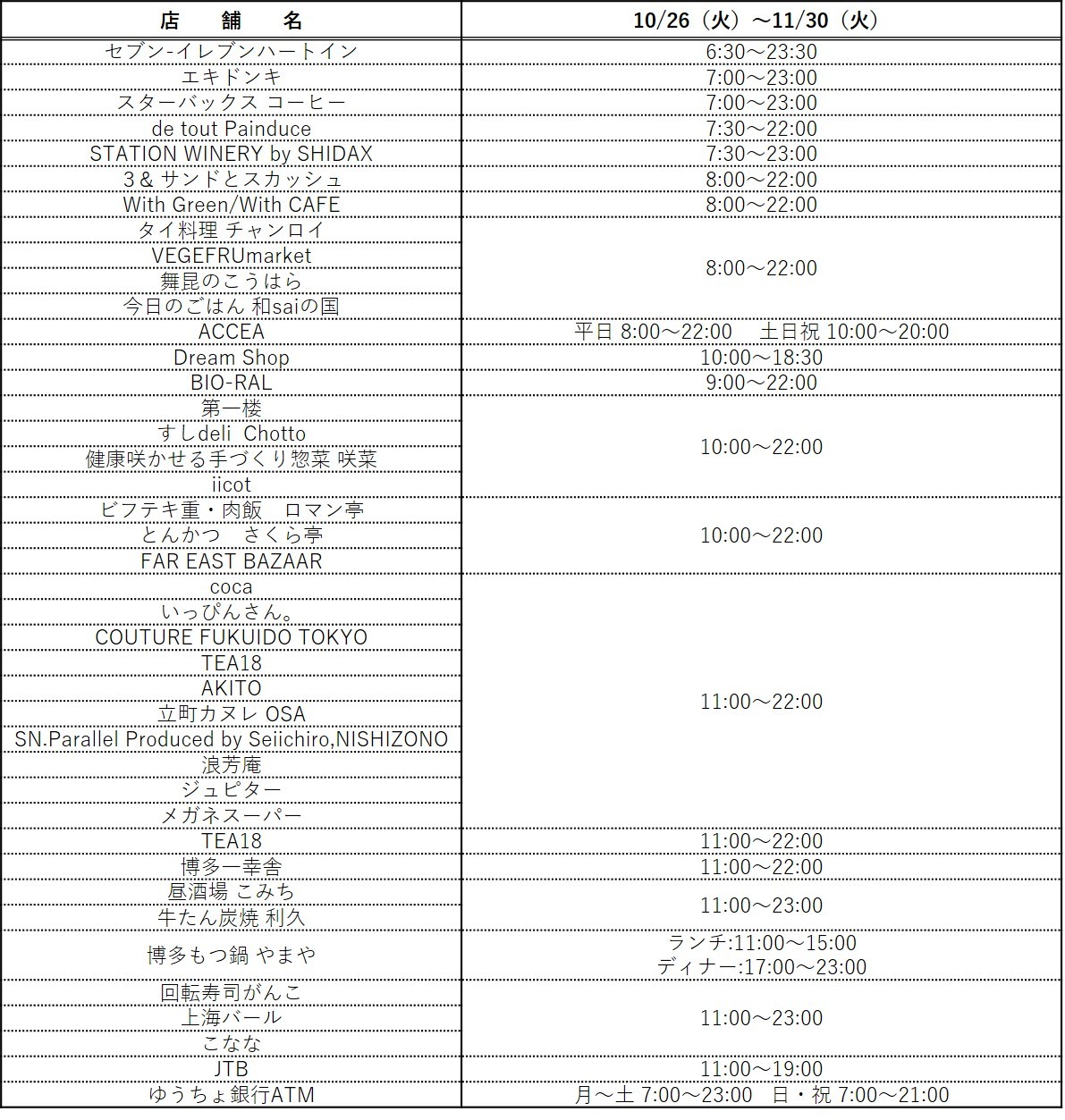 非常感谢您一直以来使用eki marche大阪。 10月26日(周二)更新开业日以后的营业时间如下所示(10月26日~11月30日)。