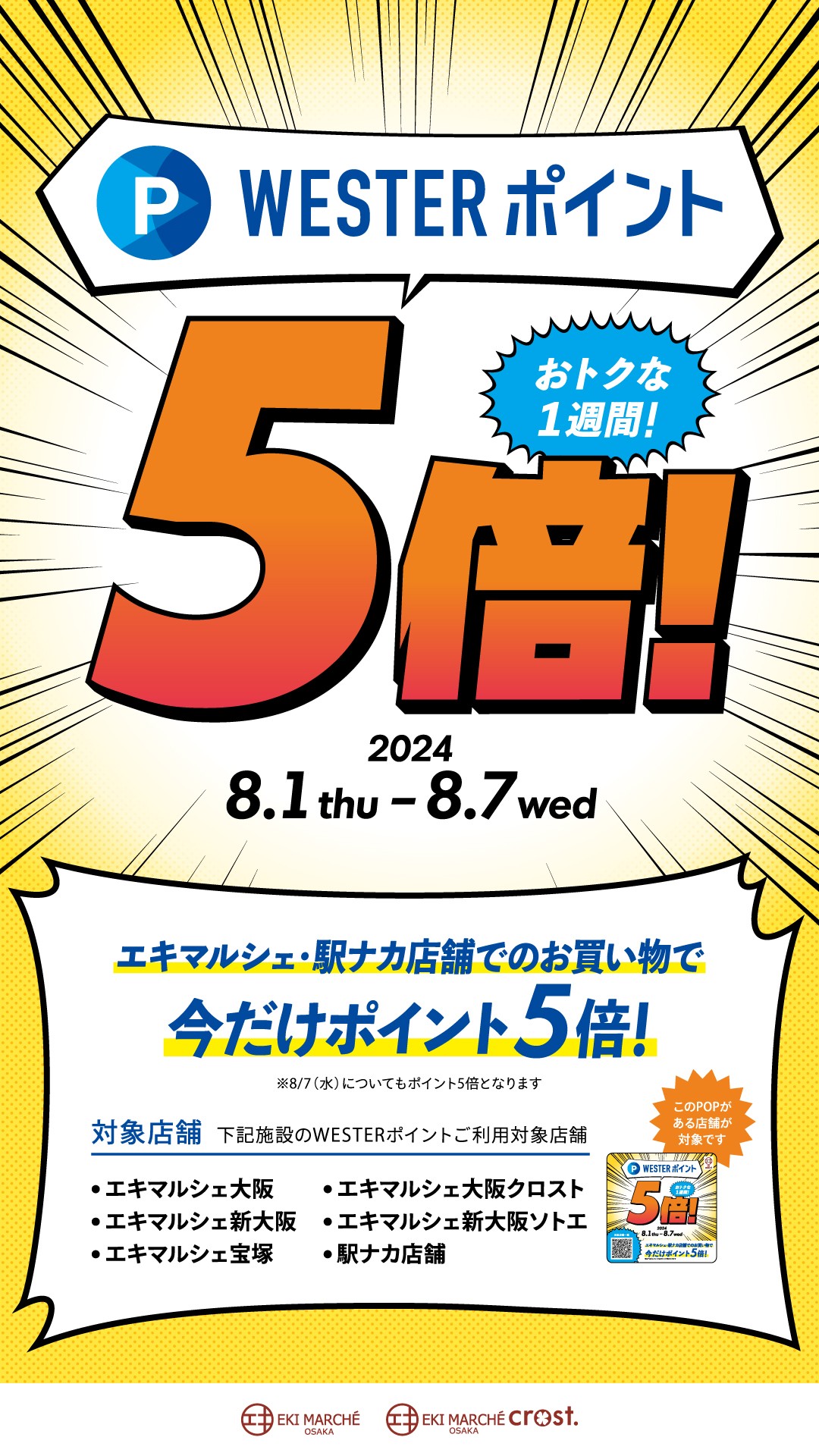 在eki marche大阪,在8/1(星期四)~8/7(星期三)期间,实施WESTER积分积5倍的活动。 ※以eki marche大阪・eki marche大阪十字内的WESTER积分加盟店为对象。 ※8/7(星期三)的积分授予率是5倍。 ※eki marche新大阪・eki marche新大阪Sotoe也成为对象。