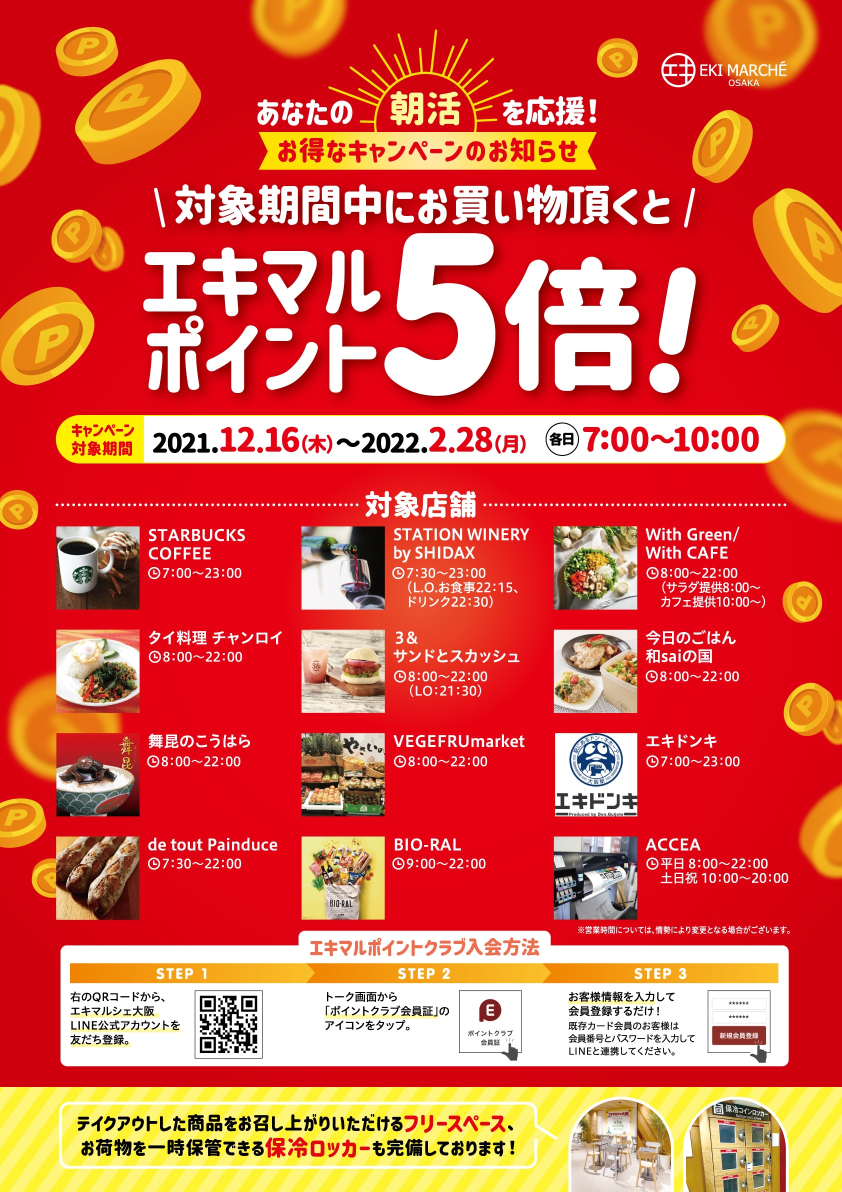 在eki marche大阪,以2021年12月16日(周四)~2022年2月28日(周一)的每日上午7点~10点的时间段在对象店铺购买的顾客为对象,实施ekimaru积分5倍活动。※与ekimaru积分2倍日重叠的情况下,上述期间上午7点~10点的时间段优先积分5倍。