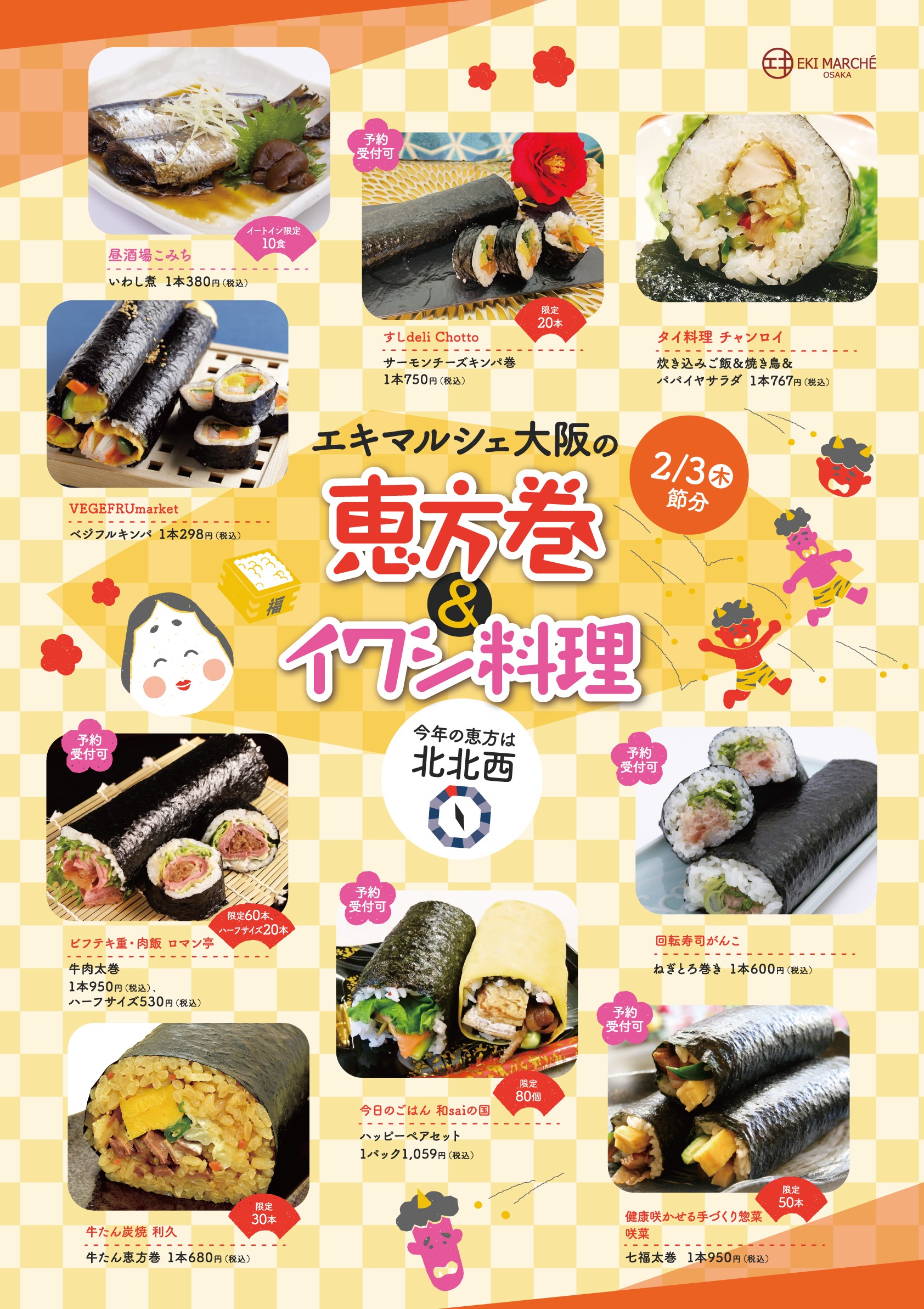 2月3日是节分。据说除了为了消灾和招福而撒豆驱邪之外,吃惠方卷和沙丁鱼的话会很吉利。今年eki marche大阪也会有丰富多样的惠方卷和沙丁鱼料理登场,请务必在工作或外出回来的路上顺便去看看!(也有很多可以预约的惠方卷)吃得好吃,祈求无病无灾吧!