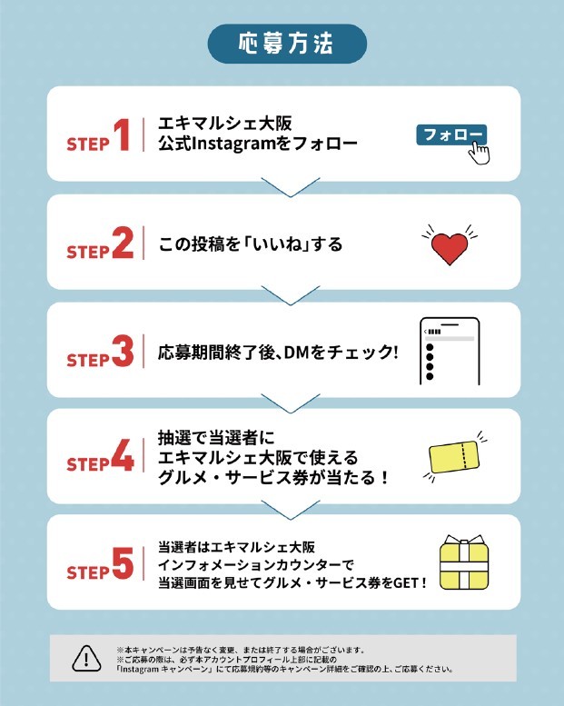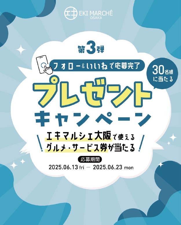 从关注eki marche大阪的Instagram账号并获得好评的人中抽选出“eki marche大阪可以使用的美食服务券”作为30名礼物!
