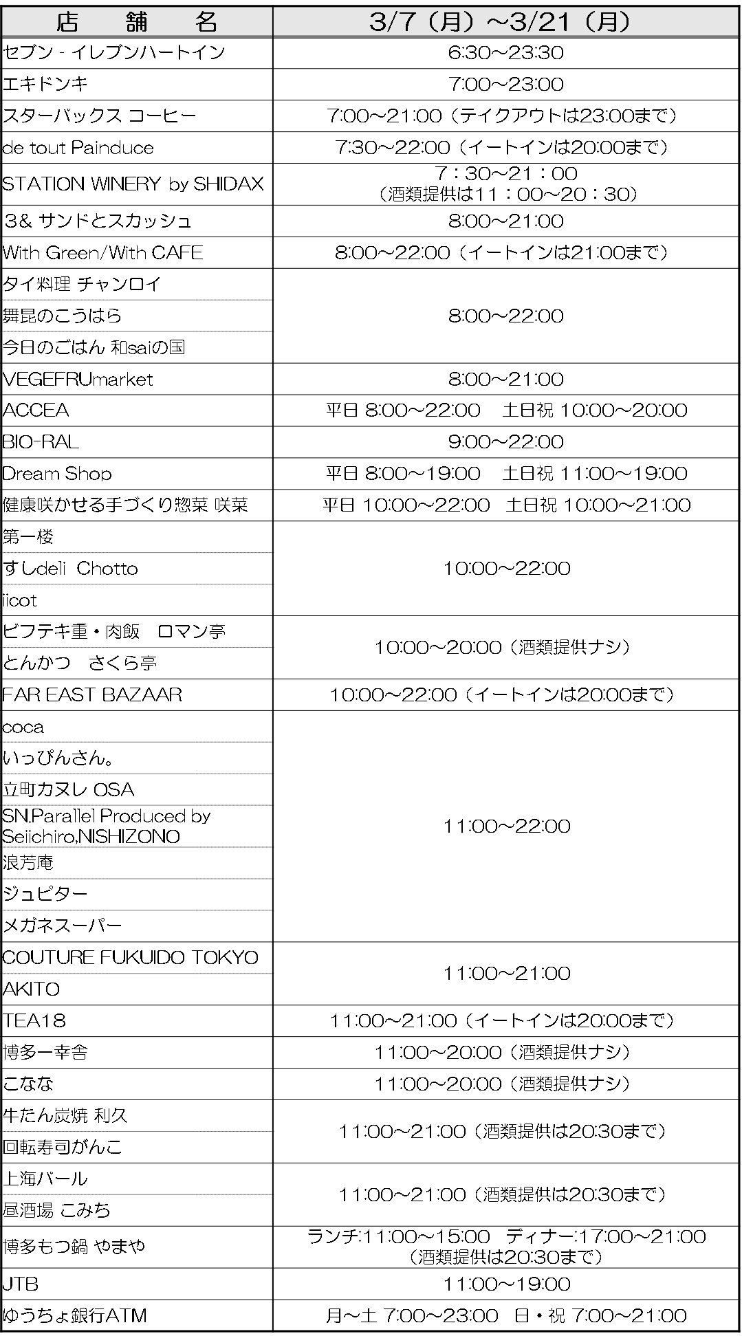 非常感谢您一直以来使用eki marche大阪。 3月7日(星期一)以后的营业时间如下所示(3月7日~3月21日)。 给客人带来不便,请您理解。 【信息更新日期:2022年3月5日】