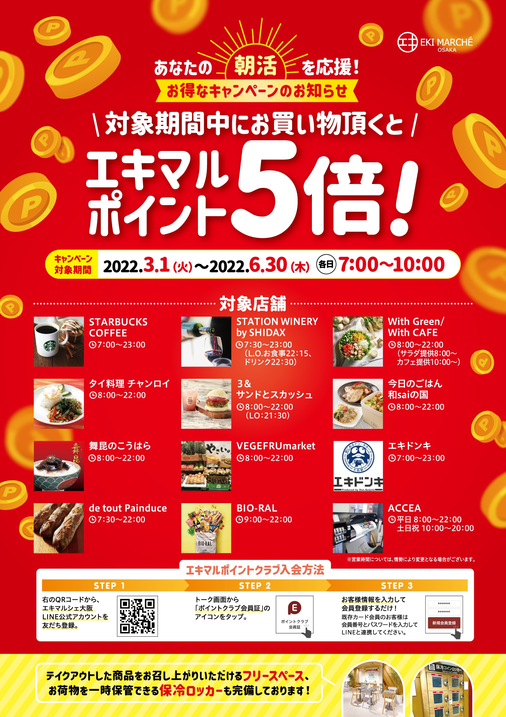 在eki marche大阪,到2022年3月末为止实施的早上时间段的积分5倍活动将延长到6月30日(星期四)。