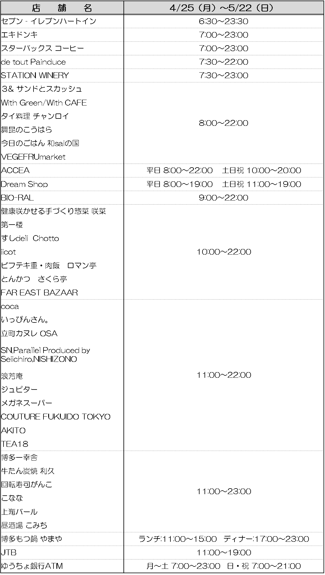 非常感谢您一直以来使用eki marche大阪。 4月25日(星期一)以后的营业时间如下所示。(4月25日~5月22日) 另外,5月11日(星期三)是休馆日。 给客人带来不便,请您谅解。 到4月24日为止的营业时间在这里↓ https://osaka.ekimaru.com/news/43