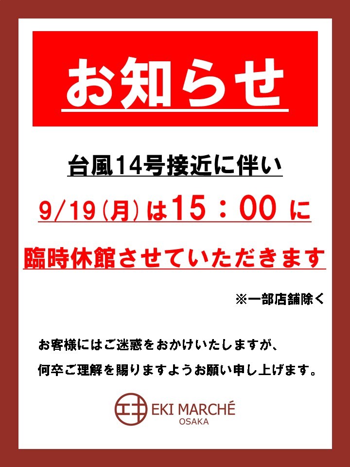 非常感谢您利用eki marche大阪。 由于14号台风的接近,2022年9月19日(星期一)15点全馆临时休业。 给客人带来不便,请您理解。