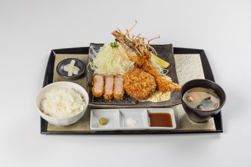 这是一套可以品尝到美味超群的特大炸虾、虾味丰富的融化奶油可乐饼、还有茶美猪特有的脂肪和肉美味的罗斯猪套餐。请一定要品尝一下。 虾奶油可乐饼&有头炸虾&烤猪排套餐 1,880日元(含税)