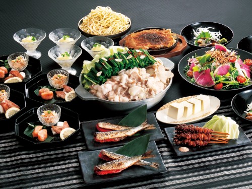 这是带有打包用的土特产明太子的套餐。您可以尽情享受更精致的绝品和人气的内脏锅。 吟味路线 1人份5,000日元(含税) ※照片为4人份(订单为2人份) ※仅提供晚餐时间(17:00-22:00L.O.)