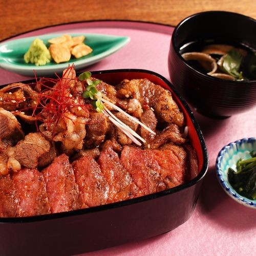 用铁板烤成中等熟的拌饭和用甜辣酱腌制的牛排骨,米饭前进的相盛重。 比夫特基&排骨重 1,360日元(含税)