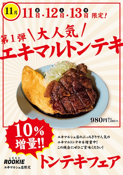 大众食堂ROOKIE在11月11日(周五)~13日(周日)期间限定,以增加10%的量销售人气的异国情调。 请一定趁这个机会品尝一下。 含税1,089日元(※以太网价格)