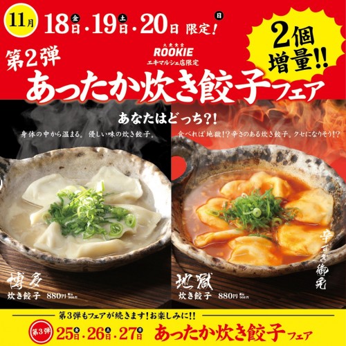 大众食堂ROOKIE在11月18日(周五)-20日(周日)期间限定,以增加2个煮饺子的量销售。 请一定趁这个机会品尝一下。 含税968日元(※以太网价格)