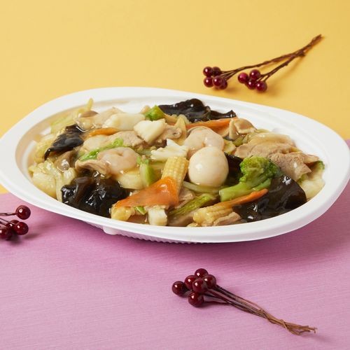 厨师也推荐! 虾、乌贼、猪肉中加入了鹌鹑蛋、白菜、胡萝卜、年轻人玉米、蘑菇、黑眼圈等丰富多彩的食材,是一个看不到面的撒豆沙炒面。在寒冷的季节里吃一盘营养丰富的食物。 五目浇汁炒面 650日元(含税)