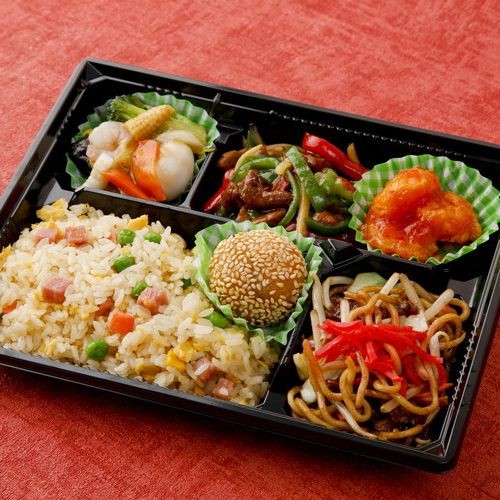 将青椒里脊肉和芝麻丸子等正宗中华料理和点心色彩鲜艳地组合在一起。这是非常适合想吃各种菜肴的人的中华便当。 中华彩便当 840日元(含税)